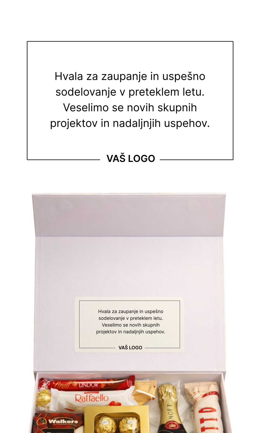 Vaš logotip lahko vključimo na personaliziranem sporočilu in/ali na darilni škatli, kar omogoča subtilno promocijo vaše blagovne znamke. Poslovna darila z logotipom so primerna za novoletna obdarovanja, dogodke in krepitev prepoznavnosti podjetja.